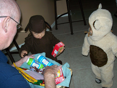 We don't know what Halloween is, but after this last one, we really like it! We had a long day, but it was lots of fun! We got up and went to see Papa in the morning. He thought we looked so cute. All we did is show up in our costumes and he and Nana had a basket full of goodies for us! (and some of it was for Daddy and Mommy, too.) Here we are as a Monkey (Josiah) and Teddy Bear (Jonathan). Here we are getting our first look at the goody basket from Nana and Papa!